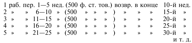 1-й рабочий период: 1–6-я недели. В конце 6-й недели имеется товарный капитал в 600 ф. ст., которые возвратятся в конце 9-й недели.