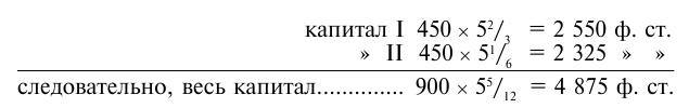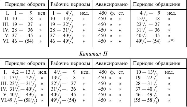 В течение 51 недели, которые мы здесь принимаем за год, капитал I закончил шесть полных рабочих периодов, следовательно, произвёл товаров на 450 × 6 = 2 700 ф. ст., а капитал II за пять полных рабочих периодов произвёл товаров на 450 × 5 = 2 250 ф. ст. Кроме того, капитал II за последние 1½ недели года (с средины 50-й до конца 51-й недели) произвёл ещё на 150 ф. ст., т. е. всего продукта за 51 неделю произведено на 5 100 ф. ст. Следовательно, с точки зрения непосредственного производства прибавочной стоимости, производимой только в течение рабочего периода, весь капитал в 900 ф. ст. обернулся бы 52/3 раза (900 × 52/3 = 5 100 ф. ст.). Но если мы рассмотрим действительный оборот, то увидим, что капитал I обернулся 52/3 раза, так как в конце 51-й недели ему предстоит ещё в продолжение 3-х недель заканчивать свой шестой период оборота; 450 × 52/3 = 2 550 ф. ст.; а капитал II обернулся 51/6 раза, так как прошло только 1½ недели его шестого периода оборота, следовательно, ещё 7½ недели его придутся на следующий год; 450 × 51/6 = 2 325 ф. ст.; весь действительный оборот = 4 875 ф. ст.