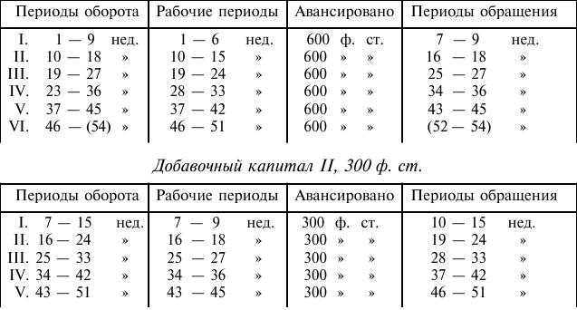 3-й рабочий период: 13–18-я недели. В продолжение 13–15 недель авансируются вышеупомянутые 300 ф. ст., затем притекают обратно 600 ф. ст., из них 300 ф. ст. авансируются на 16–18-ю недели. В конце 18-й недели имеется свободных 300 ф. ст. в деньгах; 600 ф. ст. находятся в товарном капитале, они притекают обратно в конце 21-й недели. (Более подробное изложение этого случая смотри ниже, в пункте II.)