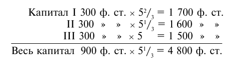 Таким образом, до конца 51-й недели получается восемь полных периодов оборота капитала в 600 ф. ст. (I: 1–9-я недели; II: 7–15; III: 13–21; IV: 19–27; V: 25–33; VI: 31–39; VII: 37–45; VIII: 43–51-я недели). Но так как 49–51-я недели приходятся на восьмой период обращения, то в течение этого времени должны вступить в дело и поддерживать ход производства 300 ф. ст. высвободившегося капитала. Тем самым в конце года оборот представится в следующем виде: 600 ф. ст. восемь раз совершили свой кругооборот, это составляет 4 800 ф. ст. К этому надо прибавить продукт последних 3 недель (49–51-й), но он совершил только треть своего девятинедельного кругооборота, следовательно, к сумме оборота следует прибавить лишь третью часть его величины, т. е. 100 ф. ст. Следовательно, если годовой продукт, считая год в 51 неделю, равен 5 100 ф. ст., то обернувшийся капитал составит только 4 800 + 100 = 4 900 ф. ст.; следовательно, весь авансированный капитал в 900 ф. ст. обернулся 54/9 раза, т. е. лишь немногим больше, чем в случае I.