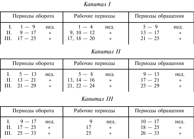 Второй период оборота с 8-й по 16-ю неделю заключает в себе второй рабочий период с 8-й по 14-ю неделю. При этом потребности 8-й и 9-й недель покрываются капиталом II. В конце 9-й недели возвращаются прежние 700 ф. ст., из них до конца рабочего периода (10–04-я недели) затрачиваются 500 ф. ст.; 200 ф. ст. остаются свободными для последующего рабочего периода. Второй период обращения продолжается в течение 15-й и 16-й недель; в конце 16-й недели снова возвращаются 700 ф. ст. Затем в каждом рабочем периоде повторяется то же самое явление. Потребность в капитале в течение первых двух недель покрывается за счёт 200 ф. ст., высвободившихся в конце предыдущего рабочего периода; в конце 2-й недели возвращаются 700 ф. ст., но от рабочего периода остаётся уже только 5 недель, так что на него может быть затрачено только 500 ф. ст., следовательно, 200 ф. ст. постоянно остаются свободными для следующего рабочего периода.