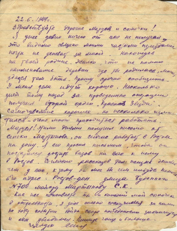 Маруся! Этими днями получил письмо от Сеньки Мартынова, он сейчас работает в Ростове-на-Дону. Я его просил письмом, чтобы он постарался достать вызов на Вас к нему в Ростов. Согласно рассказов, там жизнь дешевле, чем у Вас, к тому <же> он мог бы чем-нибудь помочь. Его адрес: Ростов-дон, улица Буденного, №70а, майору Мартынову С. К.