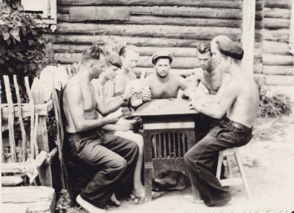 Папа в возрасте лет 16 (второй слева) вместе с дядей Афанасием (крайний слева) во дворе играет в карты… 12.05.2020