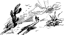 Солнце начало клониться к западу. Огромный огненный диск погружался в океан где-то далеко за Анагеймом. Спустя несколько минут он исчез, но на западе ещё горели красные, золотые и оранжевые цвета вечерней зари, похожие на длинные ленты, протянутые по всему небу. Горы резко щетинились зубцами на фоне этой зари, кактусы принимали фантастические очертания, похожие на человеческие и звериные силуэты.