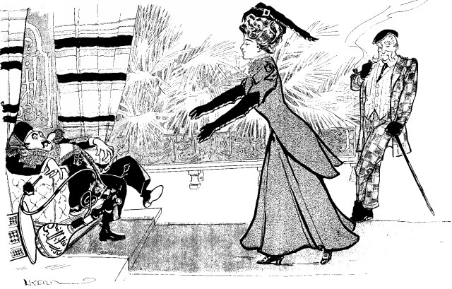 During this hurried interview Jeneka had been holding a determined thumb against the electric button. The Governor-General, waiting impatiently up the hallway, heard the prolonged buzzing and came to investigate. He found the adorable Jeneka, all trembling with indignation, in the doorway. She saw him and pointed. He looked and saw the distinguished stranger, the man of many titles and unbounded wealth, standing close to the slim princess, holding both her hands and beaming upon her with all of the unmistakable delirious happiness of love's young dream.