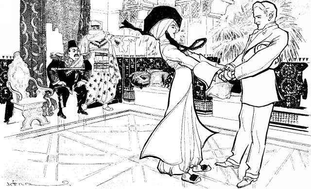 While Count Selim Malagaski was holding to his chair and trying to sort out from the limited vocabulary of Morovenia the words that could express his boiling emotions, he saw Popova standing shamefaced in the doorway. Was it really Popova? The tutor wore a traveling-suit with large British checks, a blue four-in-hand, and, instead of a fez, a rakish cap with a peak in front. As he edged into the room the young women attendants filed timidly behind him. Horror upon horrors! They were in shirt-waists, with skirts that came tightly about the hips, and every one of them wore a chip hat, and not one of them was veiled!