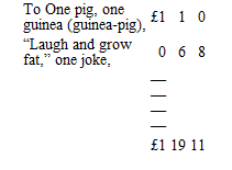 There was the Doctor-in-Law, telling a funny story to the Pig, for which he afterwards made a charge of one pound nineteen and elevenpence, describing it as Professional Attendance– and wording the bill as follows: