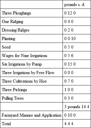 It will be interesting to add a few remarks on a system of cultivation which is practised on tracts adjoining the Desert. The land has been purchased at a price of, say, 17 pounds per acre, and the next proceeding has been to level it – by the free use of the Cassabia, or scraper, which, in roughest preparation, is drawn over and over the sand and guided something after the fashion of a plough – and then bringing it into communication by canalising with the nearest distributor of the Nile water, while in this country of exceedingly cheap labour the cost of these preparations for cultivation may be set down at about 10 pounds per acre.