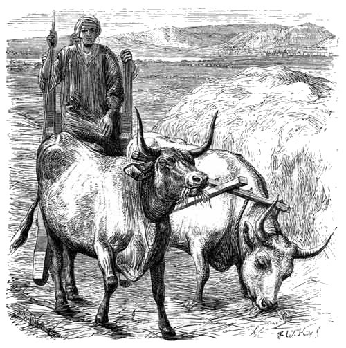 Of course such an instrument is a very ineffective one, and can but scratch, rather than plough the ground, the warmth of the climate and fertility of the land rendering needless the deep ploughing of our own country, where the object is to turn up the earth to the greatest possible depth. One yoke of oxen was generally sufficient to draw a plough, but occasionally a much greater number were required. We read, for example, of Elisha, who, when he received his call from Elijah, was ploughing with twelve yoke of oxen, i.e. twenty-four. It has been suggested, that the twelve yoke of oxen were not all attached to the same plough, but that there were twelve ploughs, each with its single yoke of oxen. This, however, was scarcely likely to be the case, as it is definitely stated that Elisha "was ploughing with twelve yoke of oxen before him, and he with the twelfth," and it is much more probable that the land was heavy, and that, therefore, the plough could not be properly worked without the additional force.
