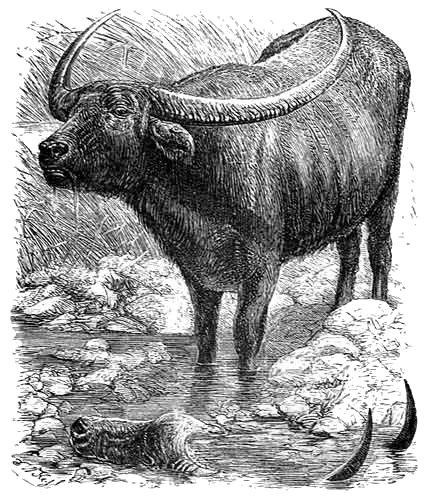Another species of the ox-tribe now inhabits Palestine, though commentators rather doubt whether it is not a comparatively late importation. This is the true Buffalo (Bubalus buffelus, Gray), which is spread over a very large portion of the earth, and is very plentiful in India. In that country there are two distinct breeds of the Buffalo, namely, the Arnee, a wild variety, and the Bhainsa, a tamed variety. The former animal is much larger than the latter, being sometimes more than ten feet in length from the nose to the root of the tail, and measuring between six and seven feet in height at the shoulder. Its horns are of enormous length, the tail is very short, and tufts of hair grow on the forehead and horns. The tamed variety is at least one-third smaller, and, unlike the Arnee, never seems to get into high condition. It is an ugly, ungainly kind of beast, and is rendered very unprepossessing to the eye by the bald patches which are mostly found upon its hide.