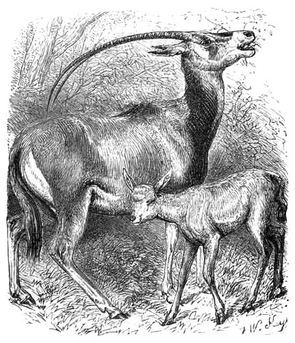 The height of the Oryx at the shoulder is between three and four feet, and its colour is greyish white, mottled profusely with black and brown in bold patches. It is plentiful in Northern Africa, and, like many other antelopes, lives in herds, so that it is peculiarly suited to that mode of hunting which consists in surrounding a number of animals, and driving them into a trap of some kind, whether a fenced enclosure, a pitfall, or a net.