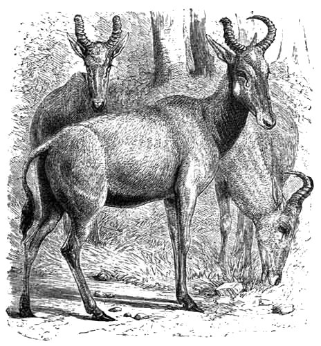 In size the Bubale is about equal to that of a heifer, and its general colour is reddish brown. The head is long and narrow, so that the heavy and deeply-ridged horns seem to stand out with peculiar boldness. The shoulders are rather high, the neck is very ox-like, and from the end of the tail hangs a tuft of long black hair. It is a gregarious animal, and is found in herds, though not of very great numbers.
