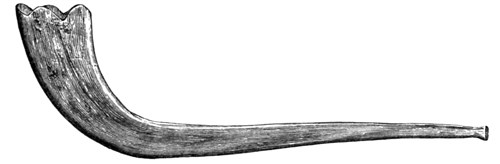 In length it measures eighteen inches, i.e. a cubit, and it is formed entirely in one piece. As far as I can judge, it is made from the left horn of the broad-tailed Sheep, which, as has already been remarked, is not spiral, but flattish, curved backwards, and forming nearly a circle, the point passing under the ear. This structure, added to the large size of the horn, adapts it well for its purpose. In order to bring it to the proper shape, the horn is softened by heat, and is then modelled into the very form which was used by the Jewish priests who blew the trumpet before the ark.