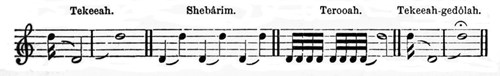 The Rabbi then stands, and gives out the names of the sacred tones in their succession. By the kindness of Dr. Herman Beigel, I have been enabled to hear the tones, and to put them into musical notes,—I believe for the first time since they have been used. The tones are four in number, and are called as follows: Tekeeah (the blowing), Shebârim (the repeated notes), Terooah (the note of joy), and Tekeeah-gedôlah (the lengthened blowing). It is not very easy exactly to express on paper these ancient tones, but the following notes will give a good idea of them.