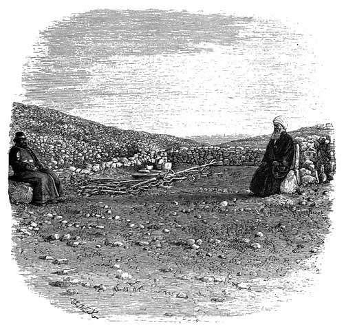 The place which is now employed in the celebration of this rite is a level spot about two hundred yards from the summit of the mountain, a place which is apparently selected on account of its comparative quiet and seclusion. Dean Stanley thinks that in former times, when the Samaritans were the masters of the country, they celebrated the sacrifice on the sacred plateau on the very summit of the mountain, so that the rite could be seen for a vast distance on every side. Now, however, the less conspicuous place is preferred. By the kindness of the Palestine Exploration Society, I am enabled to present the reader with a view of this sacred spot, taken from a photograph made an hour or two before the time of sacrifice. The rough, rugged character of the mountain is shown by this illustration, though not so well as in several other photographs of Gerizim, in which the entire surface seems to be loosely covered with stones like those of which the low wall is built. Near the centre of the illustration may be seen a pile of sticks and the tops of two caldrons, on each of which a stone is laid to keep the cover from being blown off by the wind. These sticks nearly fill a trench in which the caldrons are sunk, and their use will be presently seen on reading Dean Stanley's narrative. In the far distance are the plains of Samaria, and the long-drawn shadows of the priest and his nephew, and probable successor, show that the time of sacrifice is rapidly approaching.