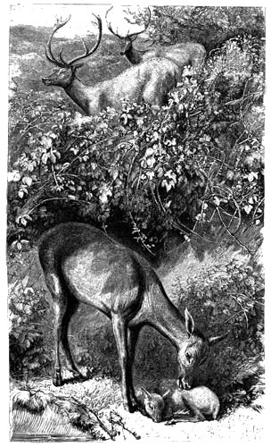 There is scarcely any animal so watchful as the female Deer, as all hunters know by practical experience. It is comparatively easy to deceive the stag who leads the herd, but to evade the eyes and ears of the hinds is a very different business, and taxes all the resources of a practised hunter. If they take such care of the herd in general, it may be imagined that their watchfulness would be multiplied tenfold when the object of their anxiety is their own young.