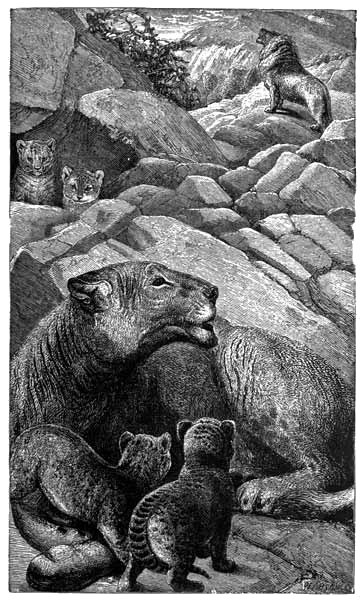 Lastly, we come to the dwelling-place of the Lion. This animal always fixes its residence in the depths of some forest, through which it threads its stealthy way with admirable certainty. No fox knows every hedgerow, ditch, drain, and covert better than the Lion knows the whole country around his den. Each Lion seems to have his peculiar district, in which only himself and his family will be found. These animals seem to parcel out the neighbourhood among themselves by a tacit law like that which the dogs of eastern countries have imposed upon themselves, and which forbids them to go out of the district in which they were born. During the night he traverses his dominions; and, as a rule, he retires to his den as soon as the sun is fairly above the horizon. Sometimes he will be in wait for prey in the broadest daylight, but his ordinary habits are nocturnal, and in the daytime he is usually asleep in his secret dwelling-place.