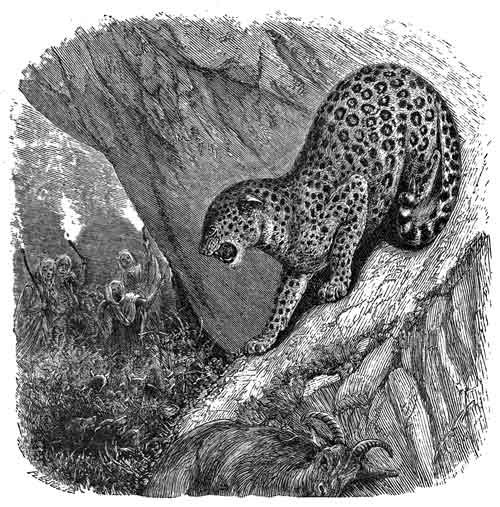 In this manner does it obtain its prey when it lives in the desert, but when it happens to be in the neighbourhood of human habitations, it acts in a different manner. Whenever man settles himself in any place, his presence is a signal for the beasts of the desert and forest to fly. The more timid, such as the deer and antelope, are afraid of him, and betake themselves as far away as possible. The more savage inhabitants of the land, such as the lion, leopard, and other animals, wage an unequal war against him for a time, but are continually driven farther and farther away, until at last they are completely expelled from the country. The predaceous beasts are, however, loth to retire, and do so by very slow degrees. They can no longer support themselves on the deer and antelopes, but find a simple substitute for them in the flocks and herds which man introduces, and in the seizing of which there is as much craft required as in the catching of the fleeter and wilder animals. Sheep and goats cannot run away like the antelopes, but they are penned so carefully within inclosures, and guarded so watchfully by herdsmen and dogs, that the Leopard is obliged to exert no small amount of cunning before it can obtain a meal.