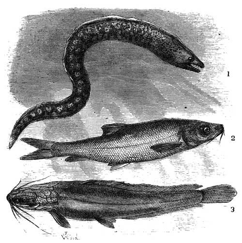 Some of the species to which this prohibition would extend are evident enough. There are, for example, the Sheat-fishes, which have the body naked, and which are therefore taken out of the list of permitted Fishes. The Sheat-fishes inhabit rivers in many parts of the world, and often grow to a very considerable size. They may be at once recognised by their peculiar shape, and by the long, fleshy tentacles that hang from the mouth. The object of these tentacles is rather dubious, but as the fish have been seen to direct them at will to various objects, it is likely that they may answer as organs of touch.