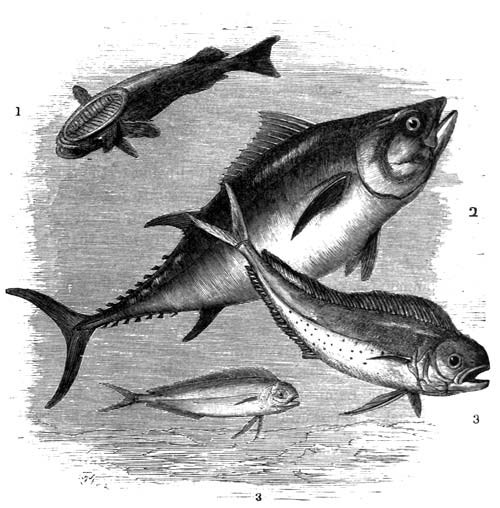 1. Sucking-fish (Echeneis remora). 2. Tunny (Thynnus thynnus).