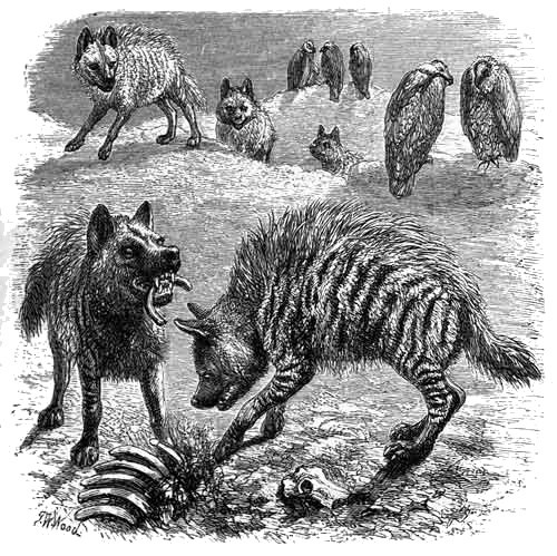 In the young animal these stripes are nearly twice as dark and twice as wide as in the adult, and they likewise appear on the face and on other parts of the body, whence they afterwards vanish. The fur is always rough; and along the spine, and especially over the neck and shoulders, it is developed into a kind of mane, which gives a very fierce aspect to the animal. The illustration shows a group of Hyænas coming to feed on the relics of a dead animal. The jackals and vultures have eaten as much of the flesh as they can manage, and the vultures are sitting, gorged, round the stripped bones. The Hyænas are now coming up to play their part as scavengers, and have already begun to break up the bones in their crushing-mills of jaws.