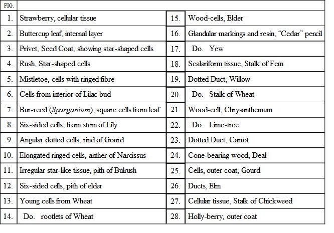 In the centre of the same Plate (Fig. 12) is a group of cells from the pith of the elder-tree. This specimen is notable for the number of little “pits” which may be seen scattered across the walls of the cells, and which resemble holes when placed under the microscope. In order to test the truth of this appearance, the specimen was coloured blue by the action of iodine and dilute sulphuric acid, when it was found that the blue tint spread over the pits as well as the cell-walls, showing that the membrane is continuous over the pits.