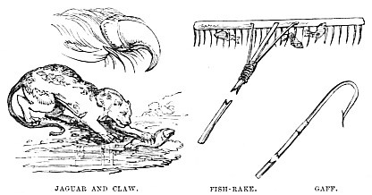 It is a well-known fact that the Jaguar feeds largely on fish, which it catches for itself. It goes down to the river-side as close to the water as possible, and waits patiently for its prey. As soon as a fish comes within reach, the Jaguar stretches out its paw to the fullest extent, and, with a stroke of the curved claws, hooks the fish on shore, just as the Vancouver Islander does with his fish-rake, or the English angler with his gaff.