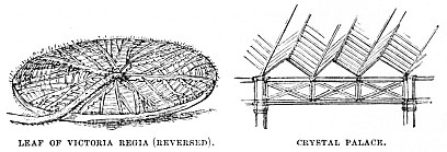 How a gardener suddenly developed into an architect remains to be seen; and, indeed, in this case the architecture was the result of the gardening, or rather, of practical botany applied to art. Some years before the invention of the Crystal Palace, that magnificent plant, the Victoria Regia, had been introduced into England. Its enormous leaves, with their wonderful power of flotation, caused a great stir at the time, and some of my readers may remember a sketch which was engraved in the Illustrated London News, and which represented a little girl standing on one of these leaves as it floated on the water.