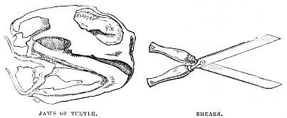 The reader, in comparing the illustration of the Turtle-jaws with that of the Shears, will see at once how exact is the analogy between the two. The sharp-edged jaws correspond with the blades of the shears, the joint at the skull corresponds with the pivot of the shears, and the muscles which move the jaws, but which could not be shown in the present illustration, are the prototypes of the handles.
