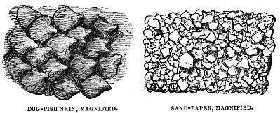 Perhaps the reader may ask why the Equisetum should be taken as the prototype of the file, and the skin of the Dog-fish as that of sand-paper. The reason is this. The flinty points of the Equisetum are set upon parallel ridges something like those of a file, while the scales of the Dog-fish are without any apparent order, being crowded against each other like the cutting particles upon the sand-paper. That there should not be an order, and that a definite one, is out of the question. But it has not yet been detected by human eyes, and therefore may be practically treated as non-existent.