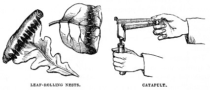 On unrolling a leaf, the hidden force was at once explained, and showed itself to be a system of accumulators exactly like those of the pistolograph or the catapult. The caterpillar spins successive belts of silken threads, and affixes them to the leaf, as shown in the illustration. These threads are nearly as elastic as the india-rubber bands of the catapult, and accordingly draw the leaf together. Another set of belts is added above the former, and, as they harden and contract in the air, they roll the leaf still further. The first row is then shortened and tightened, and a third and fourth row are added in the same fashion. So elastic are these belts, that if the leaf be carefully handled it can be almost wholly unrolled, and will spring back again as soon as the force is removed.