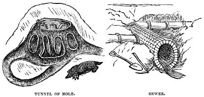 Here, again, we are met by Nature. Very few of us can appreciate the extensive subterranean works which underlie us, even where the hand of man has never been placed. Putting aside a multitude of tiny creatures, there are, in our own country, the earth-worms which pierce the ground in all directions, at the same time draining and manuring it. They penetrate it with their little burrows, thus admitting the air, which the earth needs as much as we do, and allowing moisture to take its right place. Then there are the moles, that are perpetually travelling after the earth-worms, and making drainage galleries of wonderful extent. Then there are the numerous other burrowers, such as rabbits, mice, and rats, which are common everywhere, besides the less plentiful foxes, badgers, and various burrowing birds, all of which assist more or less in the drainage of the earth.