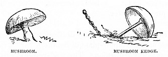 Our next sketch shows a remarkable example of similitude in form. There are certain small anchors called Kedges, which are very useful for mooring a boat where no great power of resistance has to be overcome, and a large anchor would be cumbersome. One of these is called, from its shape, the “Mushroom Kedge,” and is very useful, as, however it may be dropped, some part of the edge is sure to take the ground. This Kedge is shown on the right hand of the illustration, and the Mushroom, from which its shape was borrowed, is seen on the left.