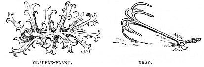 Opposite to the Grapple-plant is shown the common Drag, which is utilised for so many purposes. Generally it is employed for recovering objects that have sunk to the bottom of the water, and its use by the officers of the Humane Society is perfectly well known, the Drag being sometimes affixed to the end of a long pole, like the flesh-hook already described, and sometimes tied to a rope.