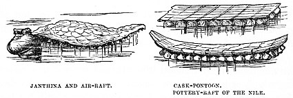 He thus forms a pontoon exactly similar in principle with the cask-pontoon which has just been described. Then, taking his place on his buoyant raft, he floats down the river until he comes to some populous town, takes his raft to pieces, sells the pots and reeds, and makes his way home again by land.