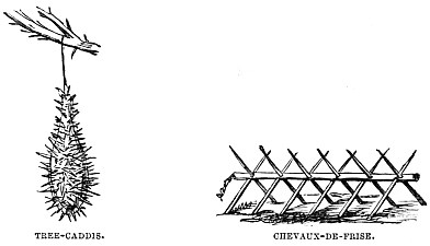 I possess many specimens of Tree-caddis, evidently belonging to several species, and in all of them the principle is the same, i.e. a number of spikes set with their ends outwards in order to defend a central position.