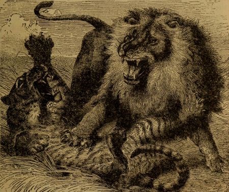 Although usually unwilling to attack an armed man, it is one of the most courageous animals in existence when it is driven to fight, and if its anger is excited, it cares little for the number of its foes, or the weapons with which they are armed. Even the dreaded firearms lose their terrors to an angry Lion, while a Lioness, who fears for the safety of her young, is simply the most terrible animal in existence. We know how even a hen will fight for her chickens, and how she has been known to beat off the fox and the hawk by the reckless fury of her attack. It may be easily imagined, therefore, that a Lioness actuated by equal courage, and possessed of the terrible weapons given to her by her Creator, would be an animal almost too formidable for the conception of those who have not actually witnessed the scene of a Lioness defending her little ones.