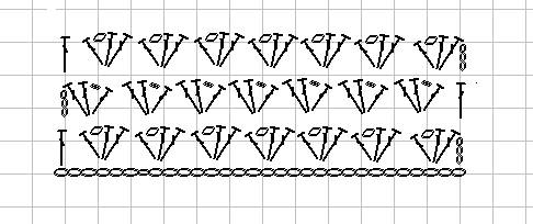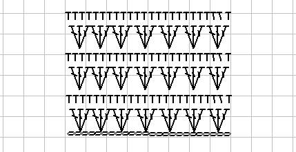 9. 5 СБН на цепочке из ВП, 7 "вееров" (2 ССН, 1 ВП, 1 ССН), 2 ССН, 3 ССН в одну петлю (в средний из трех столбиков предыдущего ряда), 2 ССН, 9 "вееров" (2 ССН, 1 ВП, 1 ССН), 2 ССН, 3 ССН в одну петлю (в средний из трех столбиков предыдущего ряда), 2 ССН, 16 "вееров" (2 ССН, 1 ВП, 1 ССН), 2 ССН, 3 ССН в одну петлю (в средний из трех столбиков предыдущего ряда), 2 ССН, 9 "вееров" (2 ССН, 1 ВП, 1 ССН), 2 ССН, 3 ССН в одну петлю (в средний из трех столбиков предыдущего ряда), 2 ССН,