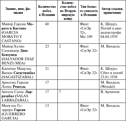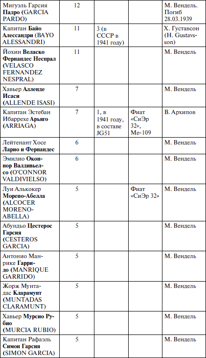 Ниже приведены таблицы асов-националистов Испании, Германии, Италии и Бельгии с персоналиями лучших асов, а за ними таблицы асов-республиканцев Испании, Франции, Югославии, США, Чехии и, отдельно, СССР, также проиллюстрированные биографическими справками лучших асов.