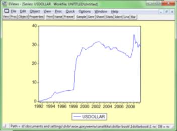 Поскольку мы уже создали рабочий файл в EViews, то построить график курса доллара, аналогичный экселевскому (см. рис. 1.2), не представляет особого труда. В рабочем файле (Workfile) EViews открываем файл USDOLLAR, после чего используем для построения диаграммы в виде графика (LINE) опции VIEW/GRAPH/LINE (см. рис. 1.7).