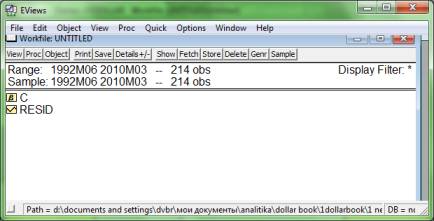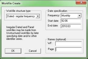 В этом диалоговом окне необходимо задать соответствующую информацию. Так, в мини-окне Workfile structure type (структура рабочего файла) мы задаем опцию Dated-regular frequency (даты с определенной частотой). Соответственно, в мини-окне Frequency (частота данных) ставим опцию Monthly (ежемесячные данные), в Start date (начальная дата) – 92:06 (июнь 1992 г.), в End date(конечная дата) – 2010:03 (март 2010 г.). Хочу заметить, что в мини-окне End date дату года нужно обязательно давать четырехзначной, в то время как в Start date она может быть двузначной. В результате у нас получится (см. рис.1. 4) неполный рабочий файл (Workfile): в нем будут отсутствовать данные, которые еще предстоит импортировать.