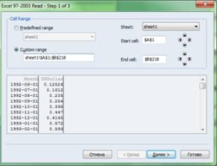 Перед импортом данных экселевский файл нужно обязательно закрыть, поскольку иначе появится сообщение об ошибке. При работе в последних версиях EViews в командной строке этой программы нужно воспользоваться опцией IMPORT/IMPORT FROM FILE. После открытия экселевского файла появится окошко Excel read‑Step 1 of 3 (см. рис. 1.5), в котором следует выбрать одну из двух опций: Predefined range (предопределенный диапазон) или Custom range (обычный диапазон). В случае выбора Predefined range в EViews загружаются уже выбранные программой данные, а если вы воспользуетесь опцией Custom range, то в этом случае можно самому выбрать требуемый диапазон данных, в том числе внести необходимые правки в опции SHEET (лист), START CELL (начальная ячейка), END CELL (конечная ячейка).