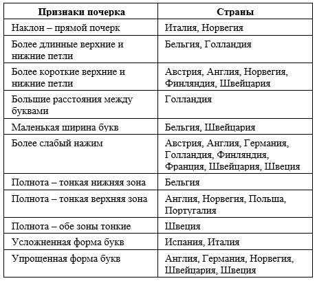 Особенности школьных прописей в различных странах в свое время систематически изучил Э. Блументаль (Blumental, 1956). Он рассматривал страны, где используется латинский алфавит. Хотя его работа была издана достаточно давно, многие данные интересны и актуальны и сегодня. В ней, что для нас наиболее интересно, представлены различия между странами в терминах признаков почерка. Выборочные результаты для ряда европейских стран приведены в табл. 1.1. Сегодня подобного рода исследований не делает, по-видимому, никто. Значение школьной прописи становится все меньше, поскольку преподавание письма радикально сокращается. Доминирует индивидуальное приспособление каждого ученика – каждый обучается письму все больше сам, без правил.