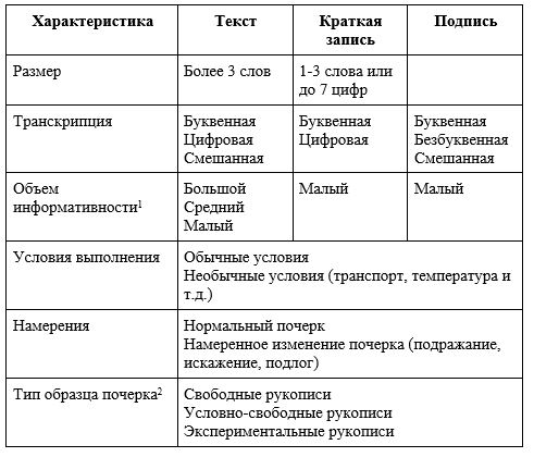 Выделяют три вида объектов (рукописей) почерковедческой экспертизы: текст, краткая запись, подпись. Эти объекты имеют различные характеристики, отраженные в Табл. 1.2 (Орлова, 2006, Серегин, 2014).