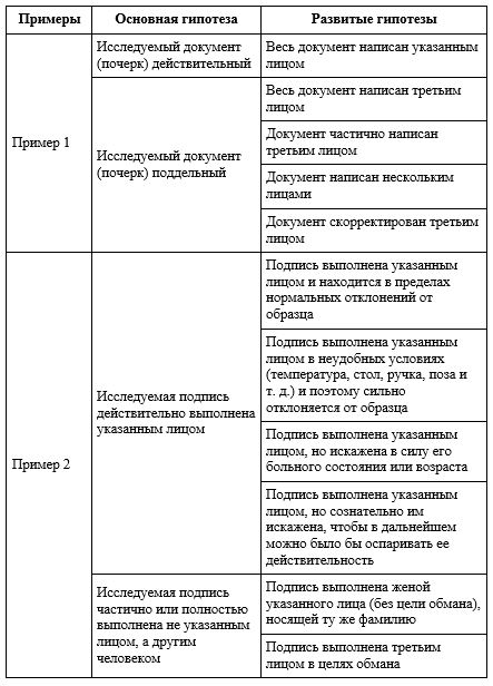 При решении идентификационных задача всегда в той иной форма встает вопрос об исполнителе рукописного текста. Был ли написан документ тем или иным лицом? Были ли все части документа написаны одним лицом? Был ли почерк намерено изменен самим автором или подделан другим лицом? Вопросы, на которые от эксперта по почерку ждут ответов, зависят от конкретного случая. Вариаций может быть очень много. Но в конечном итоге все сводится в одному: нужно сравнить исследуемый рукописный документ (или документы) с одним или несколькими образцами почерка. На основании этого сравнения и проверяются различные гипотезы (Seibt, 1999). При этом основные гипотезы развиваются дальше, формируя различные подварианты, т.е. развитые гипотезы (Табл. 1.3).
