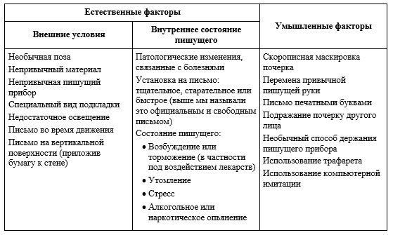 Так называемые искусственные факторы связаны с тем, что пишущий сознательно изменяет свой почерк. При этом он может стремиться просто сделать свой почерк неузнаваемым, например, в анонимных посланиях, либо пытаться подделать другой почерк.