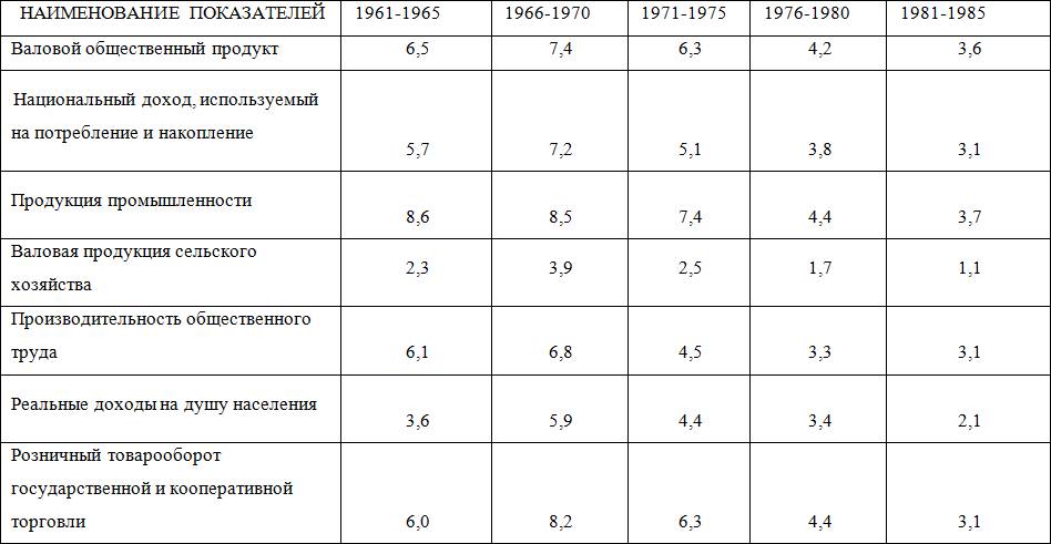 В результате всех этих проблем показатели экономического развития Советского Союза из пятилетки в пятилетку ухудшались. Это видно из таблицы 2.