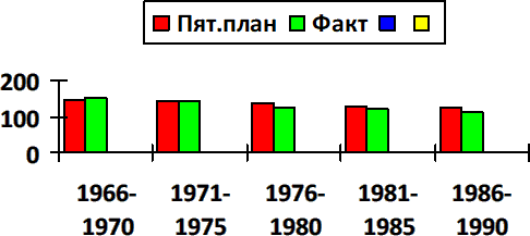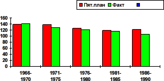 Если не считать восьмой пятилетки, где фактическое исполнение и задание пятилетки почти совпали, по остальным пятилеткам отрыв значителен и с приближением к нашему времени все более нарастал. Двенадцатую пятилетку, очевидно, в этом анализе вообще не стоит брать в расчет, так как где-то с ее середины она была принесена в жертву перестройке и о ней хозяйственные органы как бы забыли. От этого и такие удручающие результаты.
