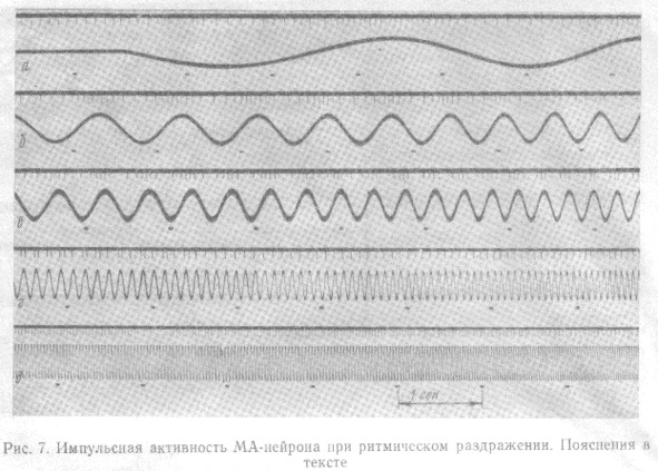 При включении ритмического раздражения, начиная от 0,1частота нейрона модулируется изменениями стимула (рис.7,затем появляются пачки импульсов (рис.7,б и в), дальнейшее увеличение f вызывает ЗЧ с отношением 1:1 (рис.7, гц, а), г). с