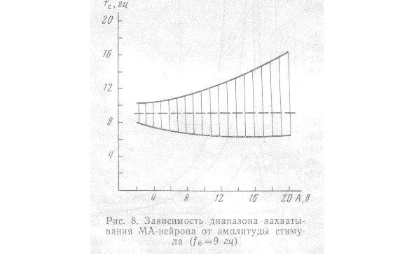 Ширина этого диапазона ЗЧ и значения его граничных частот зависят как от фоновой частоты работы нейрона f, так и от амплитуды стимула. С увеличением fдиапазон захватывания расширяется. Зависимость этого диапазона от амплитуды стимула при f = 9 представлена на рис. 8. ф ф ф гц